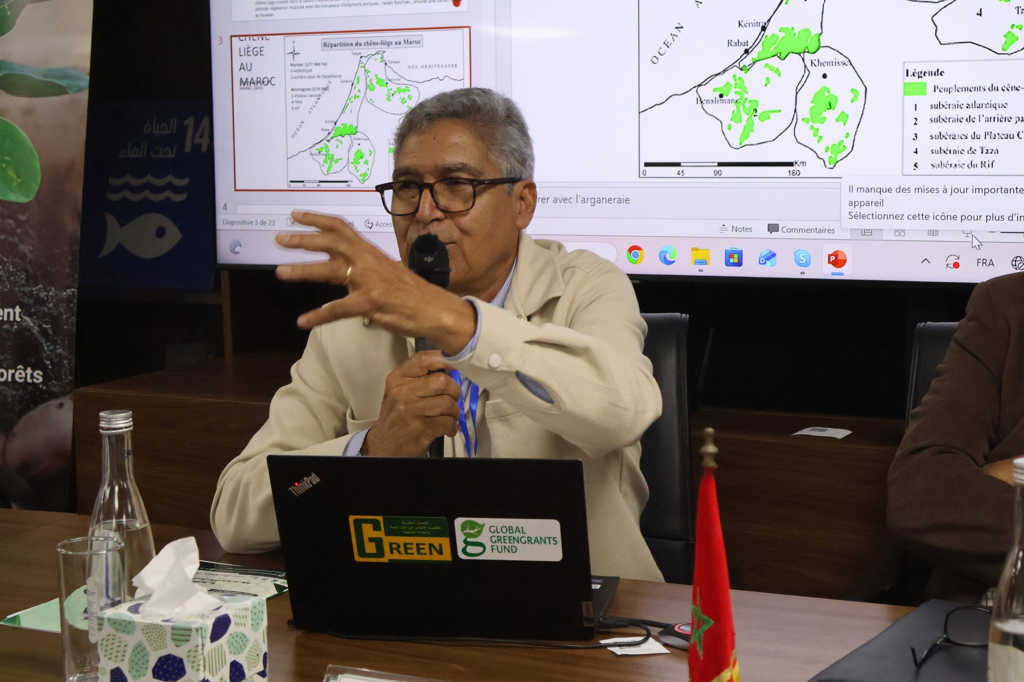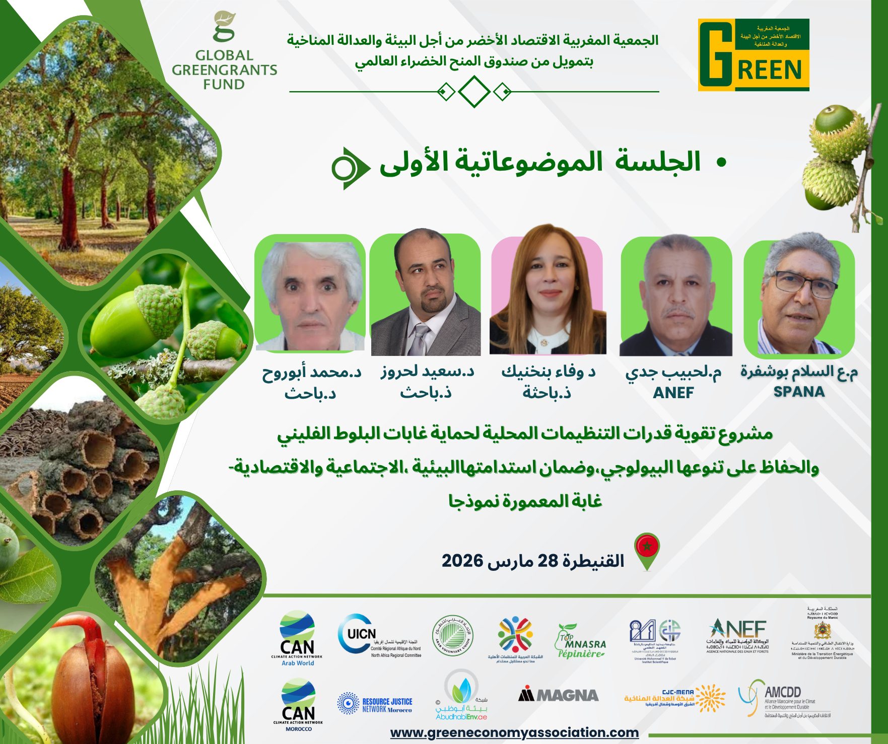 ـ المداخلة الأولى : غابات البلوط الفيليني واقع و أفاق استدامتها- الوكالة الوطنية للمياه والغابات ومحاربة التصحر. ـ المداخلة الثانية : البلوط الفليني، الشجرة الرمزية لحوض البحر الأبيض المتوسط، وللمغرب - المهندس عبد السلام بوشفرة ـ المداخلة الثالثة : ــــ تنوع الفطريات المرتبطة بالتشكيلات الغابوية بمعمورة : الدكتور محمد أبوروح ـ المداخلة الرابعة: ـ مكونات التنوع البيولوجي النباتي والحيواني في منظومات البلوط الفليني - الدكتور سعيد لحروز ـ المداخلة الخامسة : غابة المعامورة: تراث طبيعي يتعرض لضغوط بشرية ومناخية وبيولوجية شديدة - الدكتورة وفاء بنخنيك ********* البرنامج البيئي"التدبير المندمج والتكاملي لتعزيز حماية أشجار وغابات البلوط الفليني والحفاظ على تنوعها البيولوجي، وضمان استدامتها البيئية والاجتماعية والاقتصادية – غابة المعمورة نموذجا"، تحت شعار: "غابات البلوط الفليني نظام إيكولوجي مهدد بالتدهور… فلنحافظ عليها معًا"...*******البرنامج في إطار التزامات المجتمع المدني المنصوص عليها في القانون الإطار رقم 99-12 المتعلق بالبيئة والتنمية المستدامة، ومقتضيات القانون رقم 23-21 المتعلق بالغابات والثروات الغابوية، وانخراطا في دعم السياسات العمومية الرامية إلى حماية الموارد الطبيعية باعتبارها رأسمالا مشتركا بين الأجيال وركيزة أساسية للتنمية المستدامة، بمناسبة اليوم العالمي للغابات لسنة 2026، المنظم هذه السنة تحت شعار: «الغابات والاقتصادات».وينفذ هذا البرنامج البيئي المجتمعي من طرف الجمعية المغربية الاقتصاد الأخضر من اجل البيئة و العدالة المناخية بدعم من صندوق المنح الخضراء العالمي (Global Greengrants Fund)، بتعاون مع المديرية الجهوية للوكالة الوطنية للمياه والغابات ومحاربة التصحر بالقنيطرة، ومديرية التغيرات المناخية و التنوع البيولوجي لوزارة الانتقال الطاقي و التنمية المستدامة والمعهد الوطني التابع لجامعة محمد الخامس بالرباط، وبتنسيق مع عدد من الهيئات المدنية الوطنية والإقليمية، والمؤسسات العمومية، والمجالس المنتخبة. ويأتي هذا البرنامج استجابة لجملة من التحديات البيئية والاقتصادية التي تواجه غابات البلوط الفليني بغابة المعمورة، باعتبارها تراثا طبيعيا وتنوعا بيولوجيا فريدا، ومكونا إيكولوجيا أصيلا بهضبة المعمورة، وتتمثل هذه التحديات أساسا في تزايد الضغوط البشرية، من قبيل الرعي الجائر، وقطع الأشجار الغير القانوني، والاستغلال المفرط لثمار البلوط، إضافة إلى التوسع العمراني، والتغيرات المناخية التي ساهمت في تفاقم الجفاف وارتفاع درجات الحرارة وانتشار الآفات، فضلا عن محدودية الوعي البيئي لدى بعض فئات الساكنة اتجاه أشجار البلوط الفليني.ويهدف المشروع، الذي سيتم تنفيذه خلال الفترة الممتدة من 28 مارس إلى 30 ماي 2026، إلى تعزيز إشراك المجتمع المدني والتنظيمات المحلية في تدبير السياسات البيئية المرتبطة بالغابات، ورفع مستوى الوعي المجتمعي بأهمية التدبير المستدام لغابات البلوط الفليني، إلى جانب تشجيع مشاركة النساء والشباب وتمكينهم من المعارف والآليات الكفيلة بحماية هذه المنظومات البيئية ومواجهة آثار التغير المناخي. وسيستفيد من هذا المشروع 30 فاعلة وفاعلا من التنظيمات المحلية والطلبة الباحثين، من بينهم أعضاء جمعيات وتعاونيات وجامعي ثمار البلوط والرعي بغابة المعمورة، وذلك من خلال برنامج متكامل يشمل تنظيم حوارات مجتمعية ومؤسساتية وإعلامية، وورشات تأطيرية، وحملات ميدانية تحسيسية، واستطلاعات ميدانية، وإعداد دعامات تواصلية، إلى جانب تنظيم حملة تشجير وحملة نظافة بيئية بفضاءات غابة المعمورة، وصياغة مذكرات ترافعية، ودليل عملي ، تروم ترسيخ ثقافة بيئية مسؤولة ومستدامة اتجاه غابات البلوط الفليني.www.greeneconomyassociation.cominfo.green.economy.morocco@gmail.com#JournéeMondialeDesForêts#Forêts#Reboisement#ProtectionDeLaNature#DéveloppementDurable#ChangementClimatique#غابة_المعمورة#البلوط_الفليني#الحكامة_البيئية#المجتمع_المدني.#CJN_MENA#CANAW 